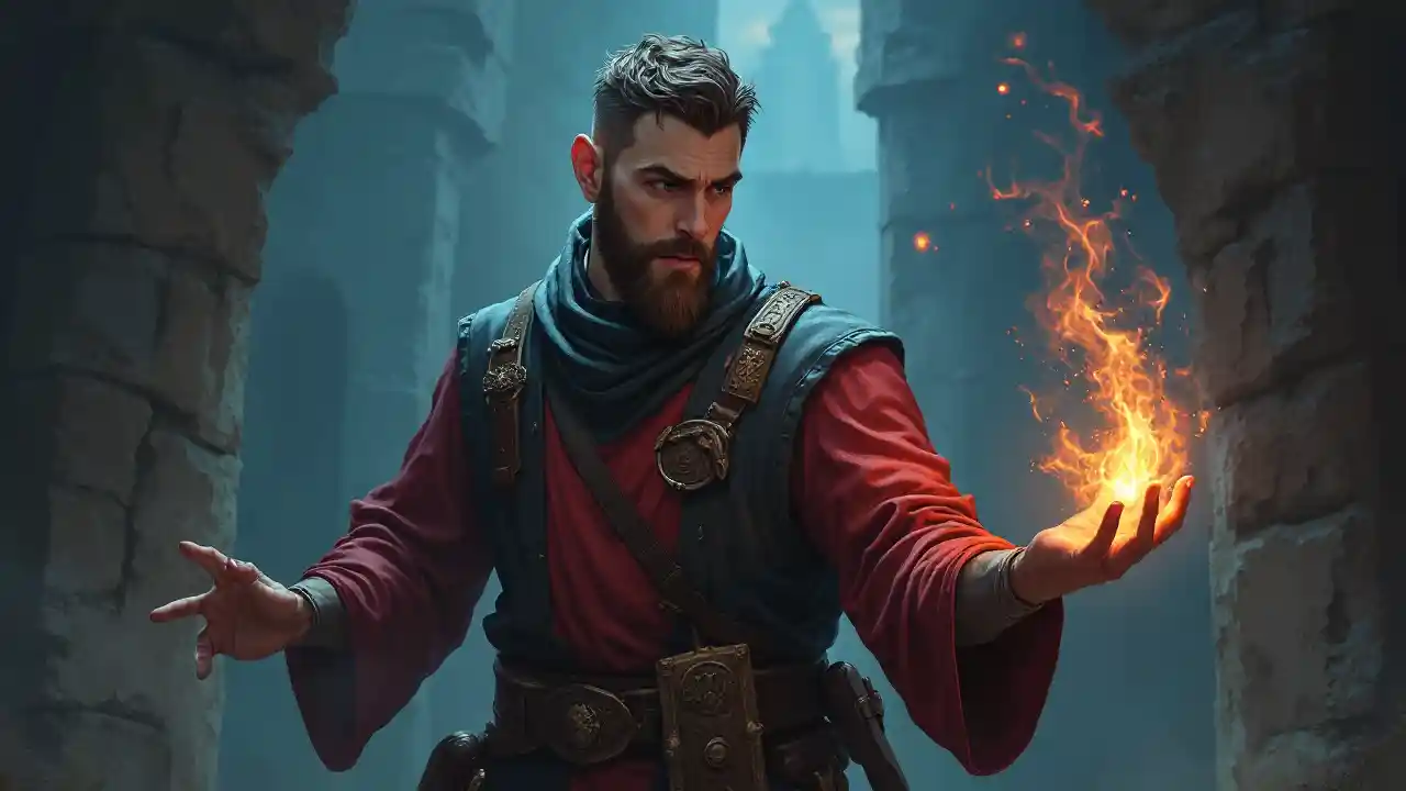 Clérigo macho fornido de gran ajuste con cabello corto y barba, en combate lanzando una magia fuera de las manos en el castillo oscuro, buscador de caminos, ajuste de d & d, alta calidad realista, calidad de sombra mejorada, colorido