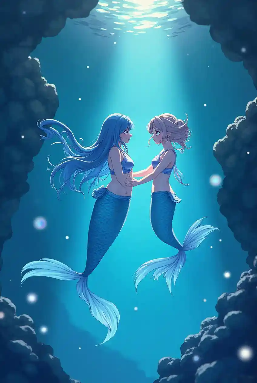 Luminous lagoon, mermaids singing enchantments, echoing serene and magical anime aesthetics.