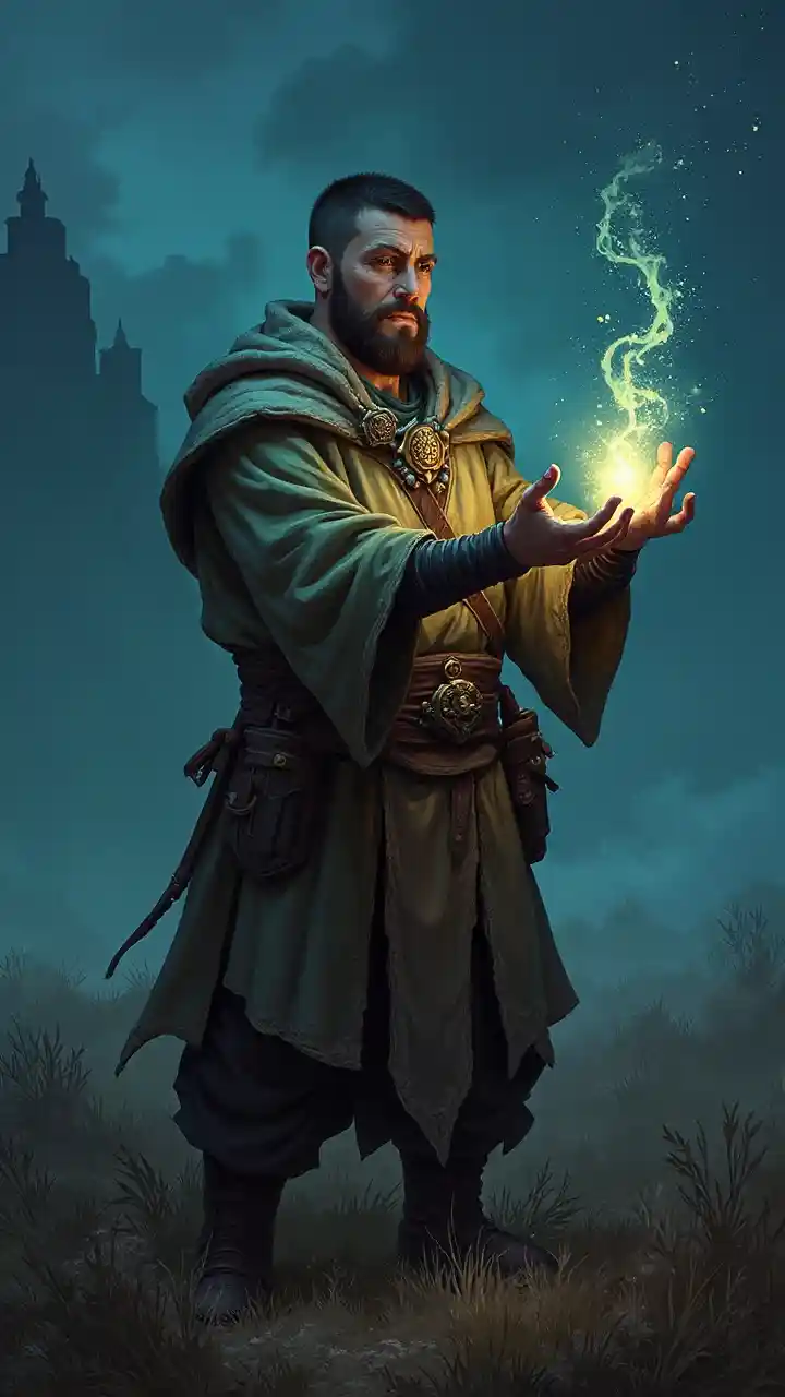 Clérigo fornido y fornido con cabello corto y barba, lanzando un hechizo de curación mágico fuera de las manos, en un campo de batalla por la noche, buscador de caminos, entorno de d & d, en un estilo de arte digital realista de alta calidad, calidad de sombra mejorada