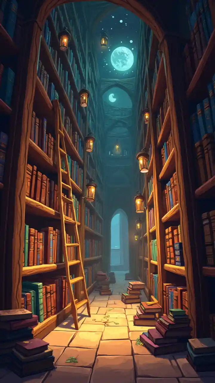 Un pasillo mágico de la biblioteca lleno de estanterías altas de madera que llegan al techo, con una clásica escalera rodante unida a los estantes. Luz suave y cálida, ambiente acogedor y misterioso. Detalles ricos, partículas brillantes en el aire, estilo de dibujos animados caprichoso y encantador. Ilustración de fantasía 2D estilizada, con texturas intrincadas, entorno inmersivo, sin personajes. → Ajuste la composición para que la escalera rodante clásica esté unida a las estanterías en el costado, no en el centro del pasillo. Agregue más elementos mágicos como partículas flotantes brillantes, libros encantados con auras suaves y destellos sutiles. Haga que el estilo sea más caprichoso y caricaturesco, con una atmósfera de libro de cuentos de fantasía cálida y encantadora. Mantenga la iluminación acogedora y las texturas detalladas. No hay personajes, sólo el medio ambiente.