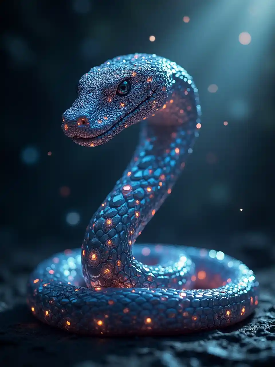 JamesUna serpiente de diamante. Fantasía 3D, estilo surrealismo. luz mágica. focos de diferentes colores. fondo oscuro