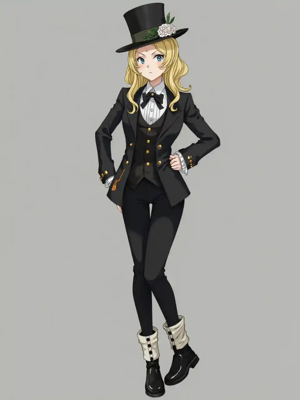Camie Utsushimi de My Hero Academia luciendo un atuendo de mago femenino: chaqueta de traje negra con botones dorados, un chaleco negro, una camisa de vestir blanca con gemelos dorados y pantalones ceñidos negros. En sus pies hay botas de tobillo negras de estilo victoriano con parte superior de tela blanca y cuatro broches de botón negro a lo largo del exterior de cada bota. En su cabeza hay un pequeño sombrero de copa negro con adornos blancos y una rosa blanca. Está de pie con la mano izquierda en la cadera izquierda. En el mismo estilo de arte de My Hero Academia.