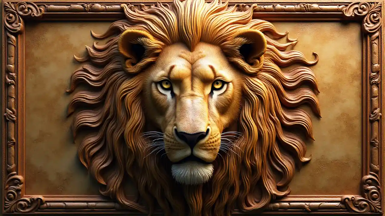 Imagina un león en un estilo de bajorrelieve en 3D, que recuerda al diseño anterior del águila. Este león presenta una melena y un pelaje intrincadamente detallados, que simbolizan la fuerza y la nobleza. Su mirada penetrante muestra el estado de alerta y la majestuosidad del animal. El esquema de color combina marrones rojizos y dorados profundos, reflejando los tonos naturales del pelaje de un león. El fondo tiene una textura sutil, lo que sugiere un ambiente de sabana. Rodeando al león hay una frontera ornamentada pero refinada, que mejora su comportamiento real.