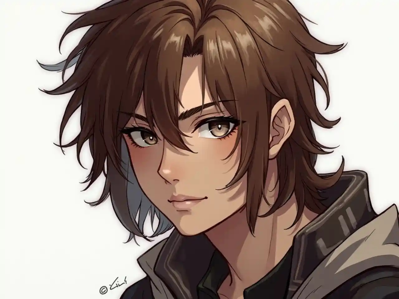 Hombre Humano para DnD personaje con cabello castaño con reflejos blancos, cabello hasta los hombros. ojo blanco, un ojo morado.