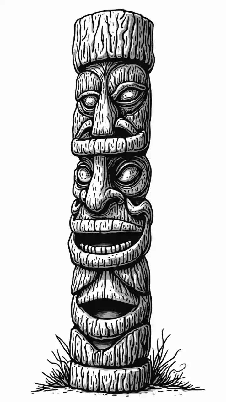 JaydenCrea una ilustración en tinta blanca y negra de un estrecho tótem tallado en madera maorí que contiene una representación de hei tiki, al estilo de Sergio Toppi, fondo blanco