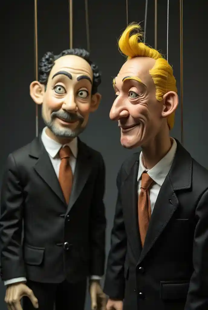 Dos marionetas masculinas de mediana edad en traje. El títere izquierdo es un hombre blanco con el pelo medio calvo. El títere de la derecha es un hombre blanco con el pelo amarillo peinado para