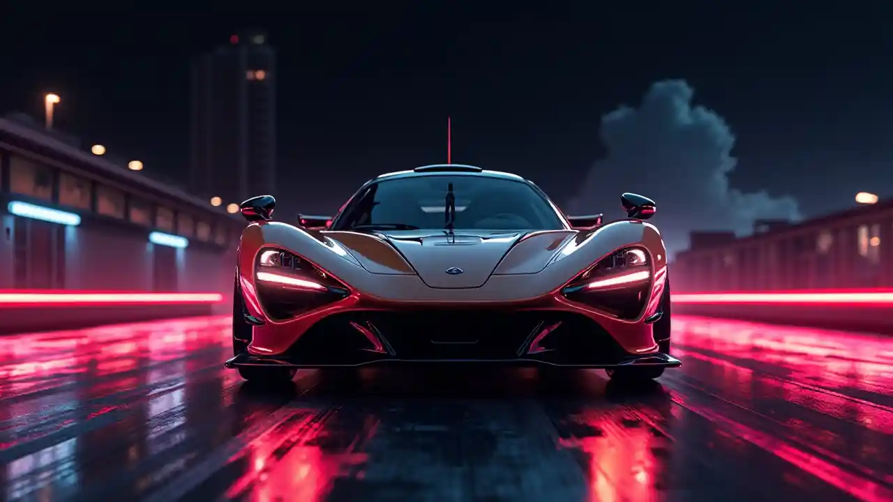 Vista frontal de un McLaren Senna en una carretera de neón y el fondo es negro