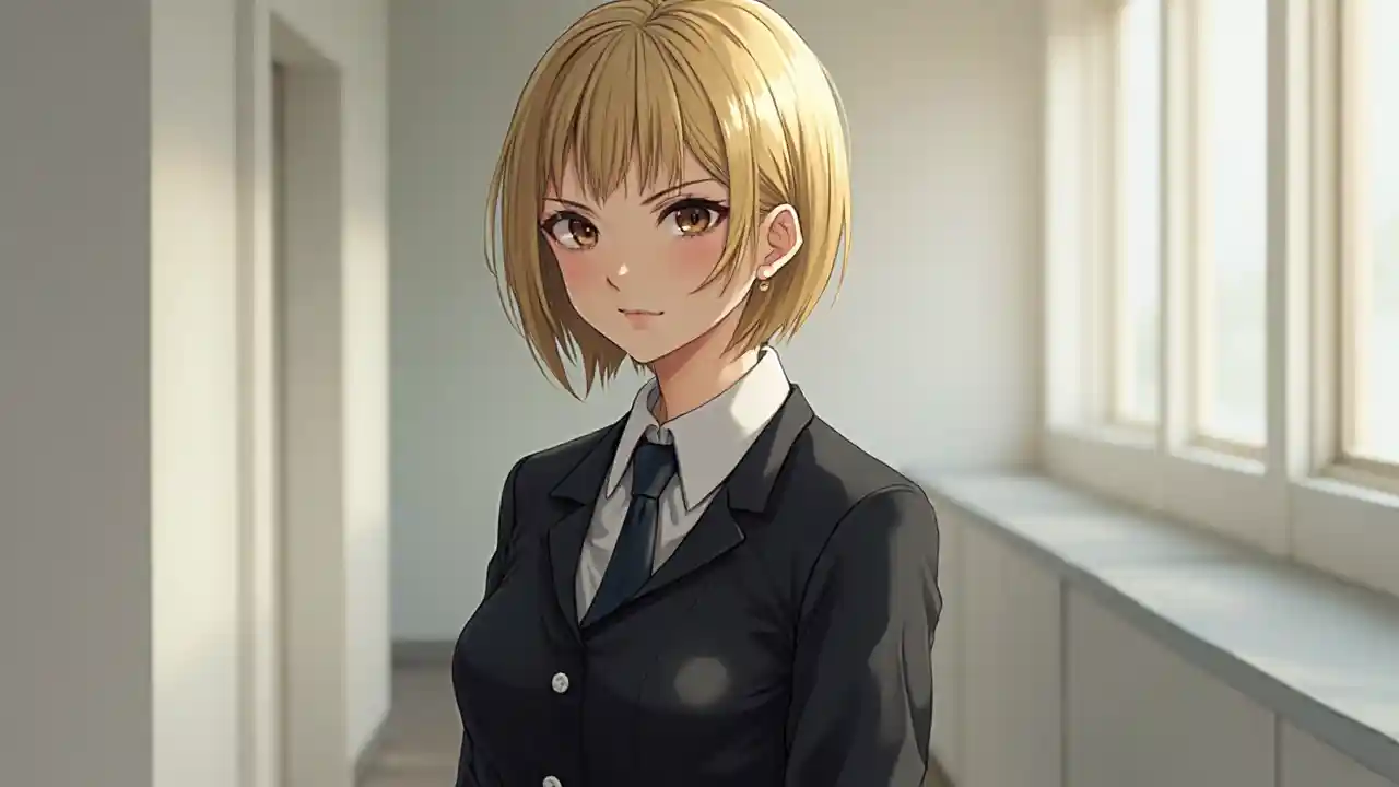MatthewCrea una imagen de una chica alta de 17 años. Lleva un uniforme escolar blanco y negro. Tiene el pelo rubio muy grueso. Su cabello está en un bob corto.