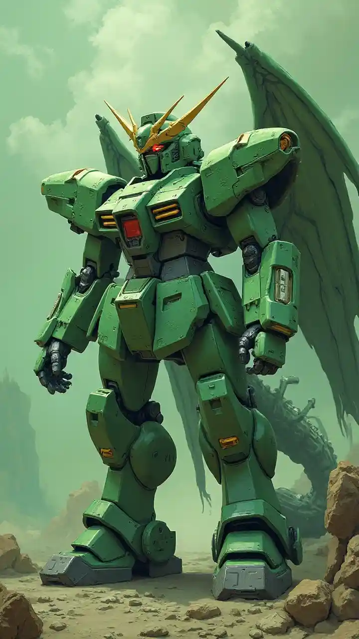 Gundam y Pacific Rim Estilo Dragon Mecha, en el estilo de la artista Naomi de Bruijn II, estilo pictórico, hiper-detalle realista, kitsch glamoroso, estética vintage, composición cinematográfica, paleta de color verde