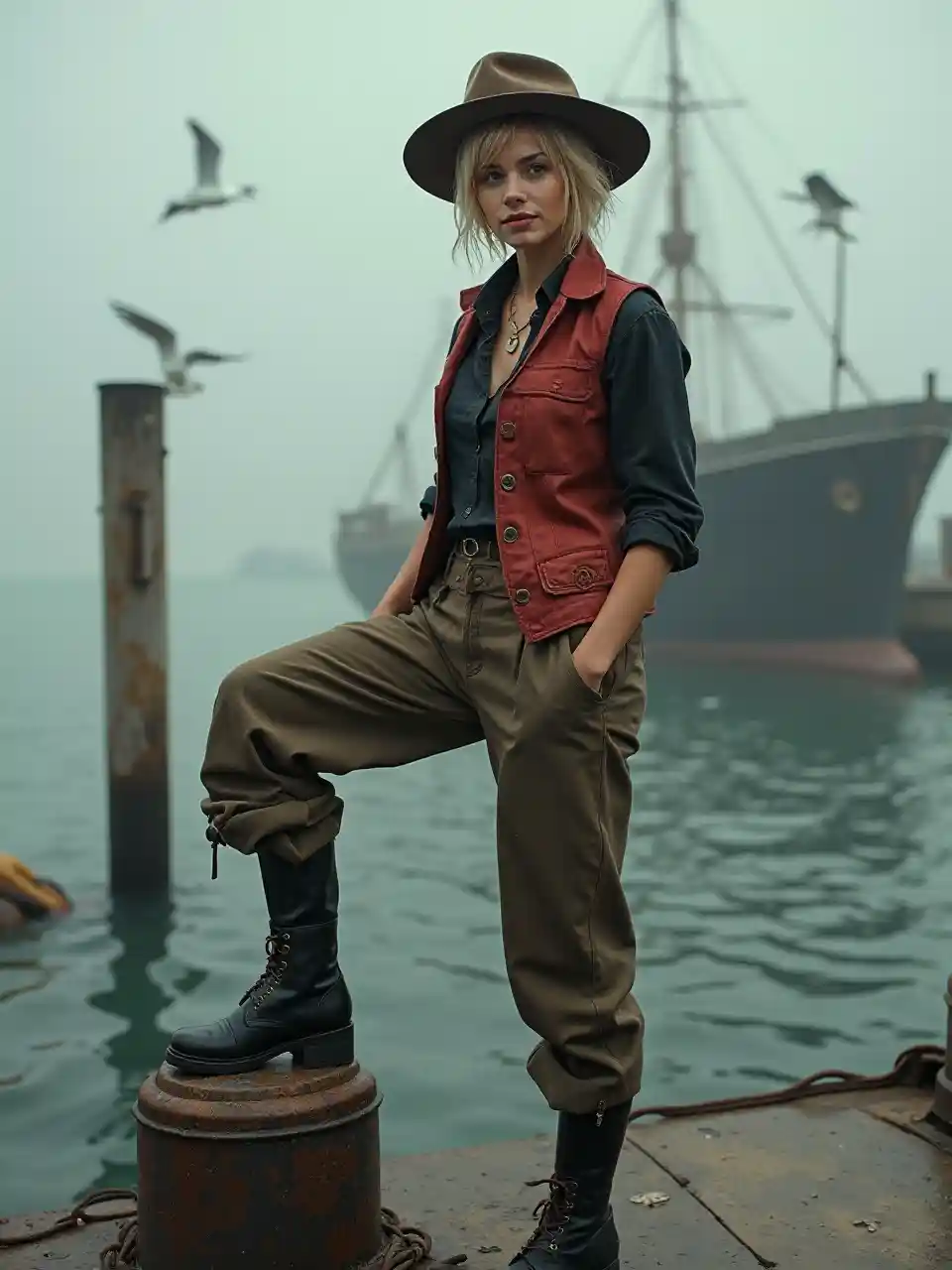 A ((((pecosa, mujer de los Balcanes mediterráneos de unos 20 años))) con ((piel de bronce y oliva)) y una complexión delgada y nervuda que sugiere que es bailarina o luchadora. Su ((cabello corto, entrecortado y rubio platino)) está peinado hacia atrás debajo de un ((sombrero de jugador manchado y arrugado)), y ella ((la ceja izquierda está dividida por una cicatriz pálida)). Sus ojos son antinaturales ((amarillo citrino)), felinos y vigilantes. Lleva un ((chaleco carmesí polvoriento sobre una camisa negra enrollada, pantalones sueltos metidos en botas con hebillas de acero hasta la pantorrilla)) y una sonrisa seductora. Se para con una bota en un bolardo de amarre oxidado, mirando fijamente la niebla donde una vez amarró un barco que ya no estaba allí. Detrás de ella, las gaviotas húmedas rodean el puerto como recuerdos que rodean la carne.