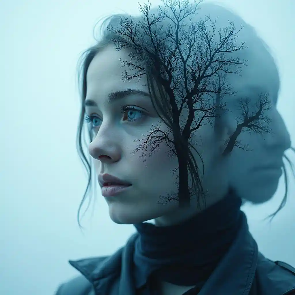 Explora la inquietante belleza de la fotografía de doble exposición con este cautivador retrato. La imagen es el rostro pensativo de una mujer superpuesto con las ramas desnudas de un árbol de invierno, creando una atmósfera introspectiva y melancólica. Los tonos azules fríos se suman a la sensación general de mal humor, mientras que la tecnología de realidad mixta aporta profundidad y realismo a la composición. Esta foto fue capturada en Zenit 11, cámara de grano de película Helios 44, mejorando aún más la expresión artística de esta impresionante imagen.