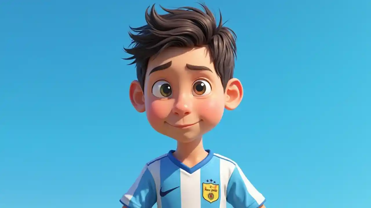 Landonlionel messi de niño, equipación de la selección argentina con colores azul y blanco, toon, personaje pixar, retrato, fondo sólido