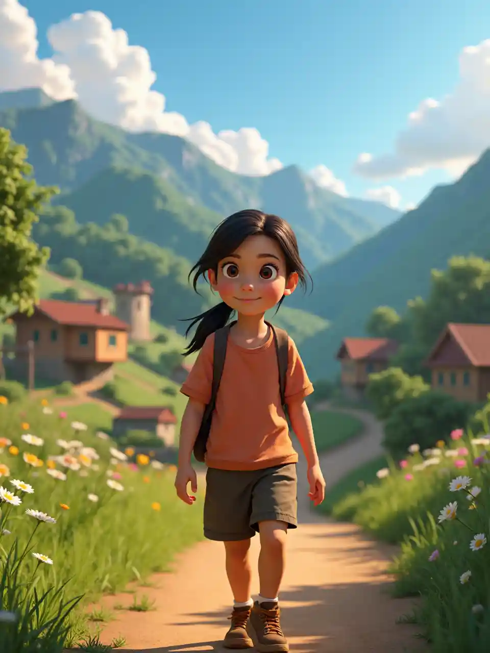 Muestre a la joven protagonista, Mia, con una expresión amable y compasiva en su rostro, caminando en un pintoresco pueblo enclavado entre colinas onduladas y exuberantes bosques, estilo Pixar animado, imagen de alta calidad, ilustración, 4k, 3D