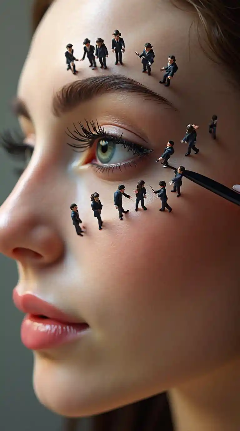 Un retrato hiperrealista de un rostro humano, con muchas personas diminutas no más grandes que una tapa de botella trabajando en las pestañas. Las personas diminutas se aplican cuidadosamente el rímel con pinceles diminutos y sostienen pequeños tubos de maquillaje. Están vestidos con uniformes de maquilladores profesionales, mostrando una intensa concentración mientras se enfocan en hacer que las pestañas se vean perfectas. La escena captura el extraordinario detalle de la cara al tiempo que enfatiza la diferencia de escala entre los pequeños artistas y su tema.