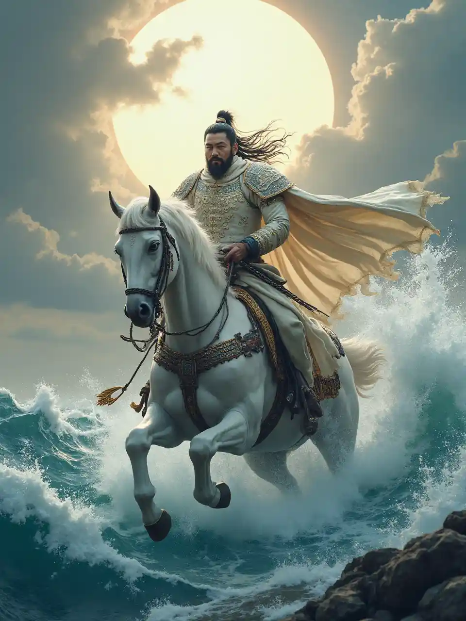Gran guerrero mongol de la antigüedad, de telas blindadas de guerrero blanco de la antigüedad, volando entre truenos, bajo el sol, sobre el mar,