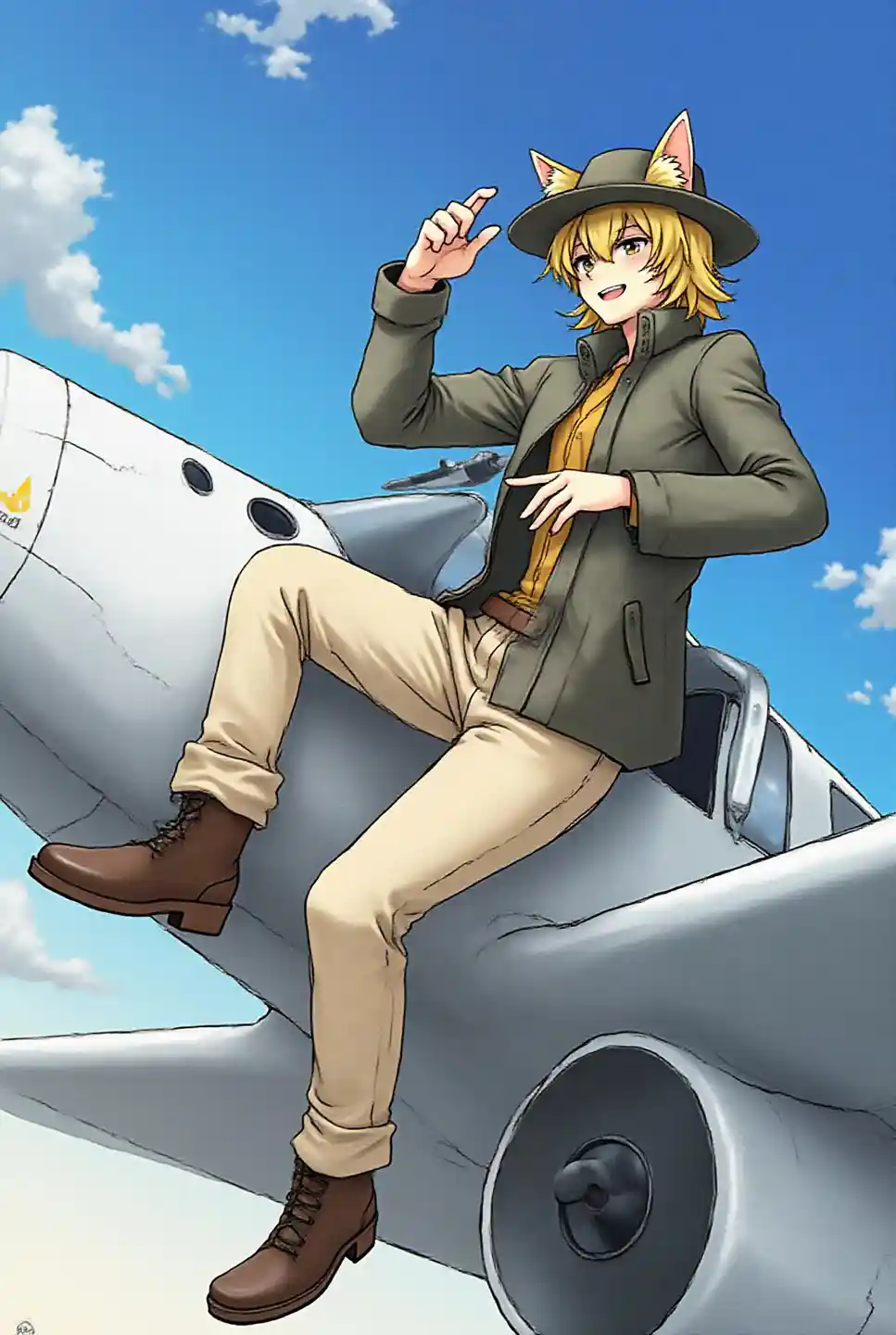 Active Angle。Adult male anthropomorphic cat.Adventurer。 male。。hat。jacket。On the wings of an airplane。long pants。boots。blue sky。action pose。Montana Jones。anime。8
