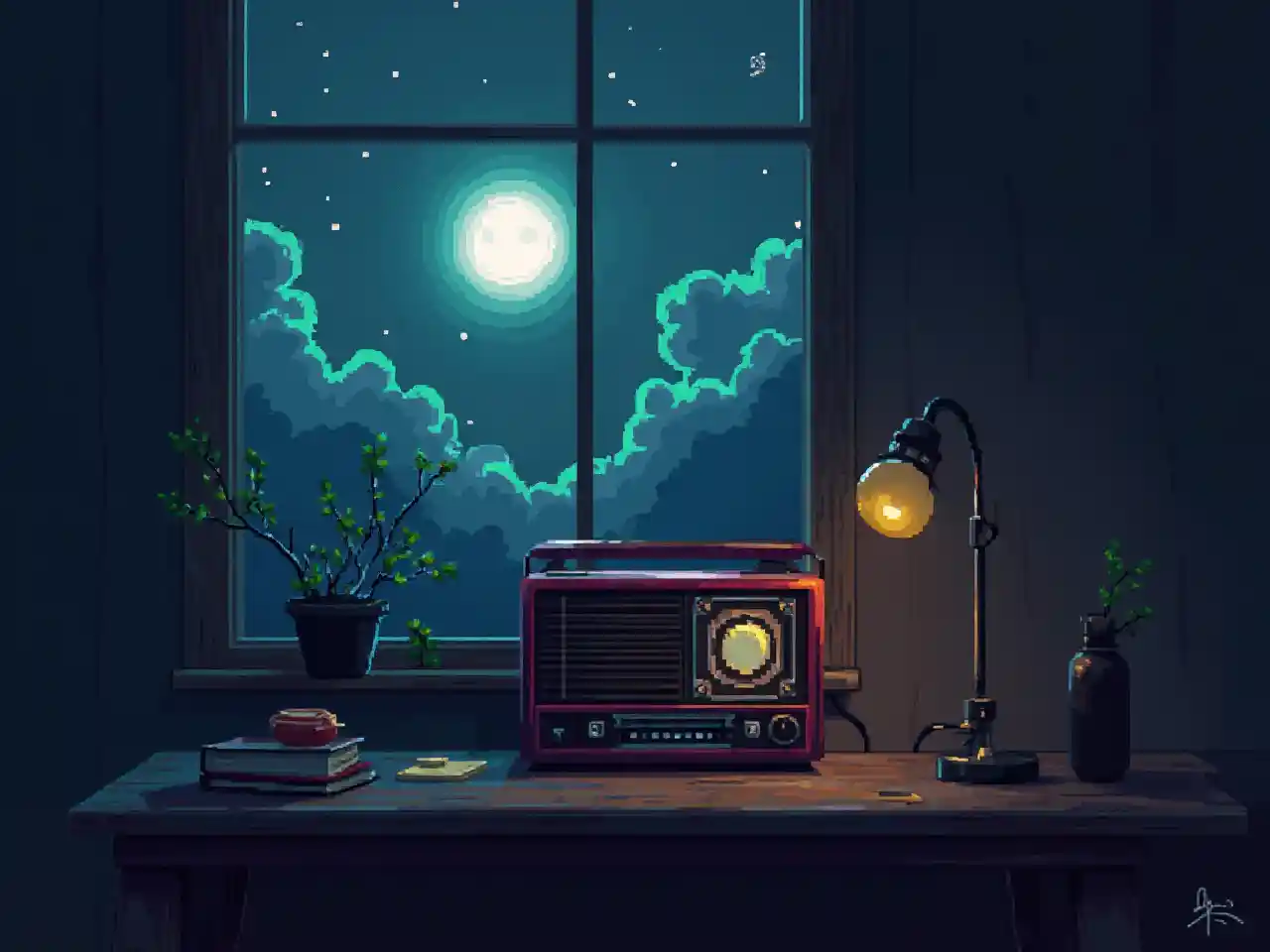 una radio retro sobre la mesa en una habitación oscura, iluminada por la luz de la luna