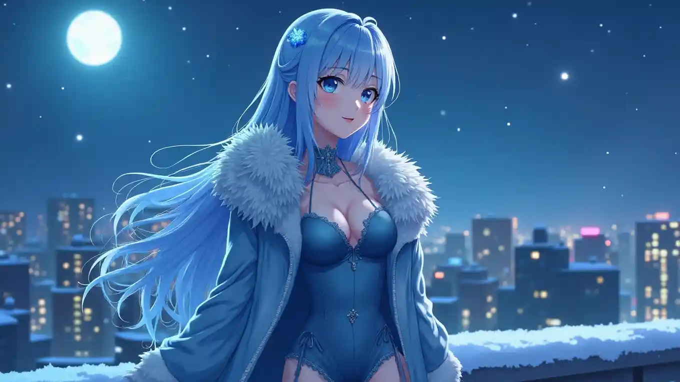 Imagen horizontal a gran escala de una chica anime Ultra HD, impresionantemente hermosa y mágica, brillando bajo la luna llena, de pie en una azotea nevada al aire libre con luces de la ciudad debajo, vistiendo un abrigo con ribetes de piel sobre un vestido ajustado con un escote pronunciado y medias hasta los muslos, su cabello largo brillando con escarcha y una sonrisa serena, ojos brillantes, piel brillante, paleta de colores azul helado y plateado, rasgos refinados, maquillaje impecable, vibraciones mágicas y románticas, brillo suave e iluminación ambiental, enfatizando su elegante y bien definido pecho con un sutil escote, y piernas largas y tonificadas con una postura serena, irradiante belleza y belleza.