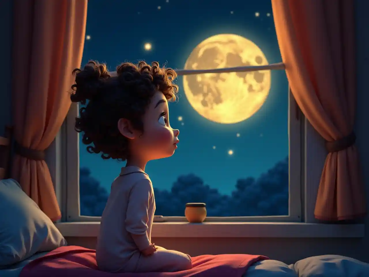 Una acogedora escena nocturna de una niña pequeña con el pelo rizado en pijama, de pie junto a la ventana de su dormitorio, mirando una luna llena brillante. La cálida luz amarilla de su habitación contrasta con el profundo cielo azul de la noche. Las estrellas brillan suavemente. Estilo: Animación 3D inspirada en Pixar, colores vibrantes.