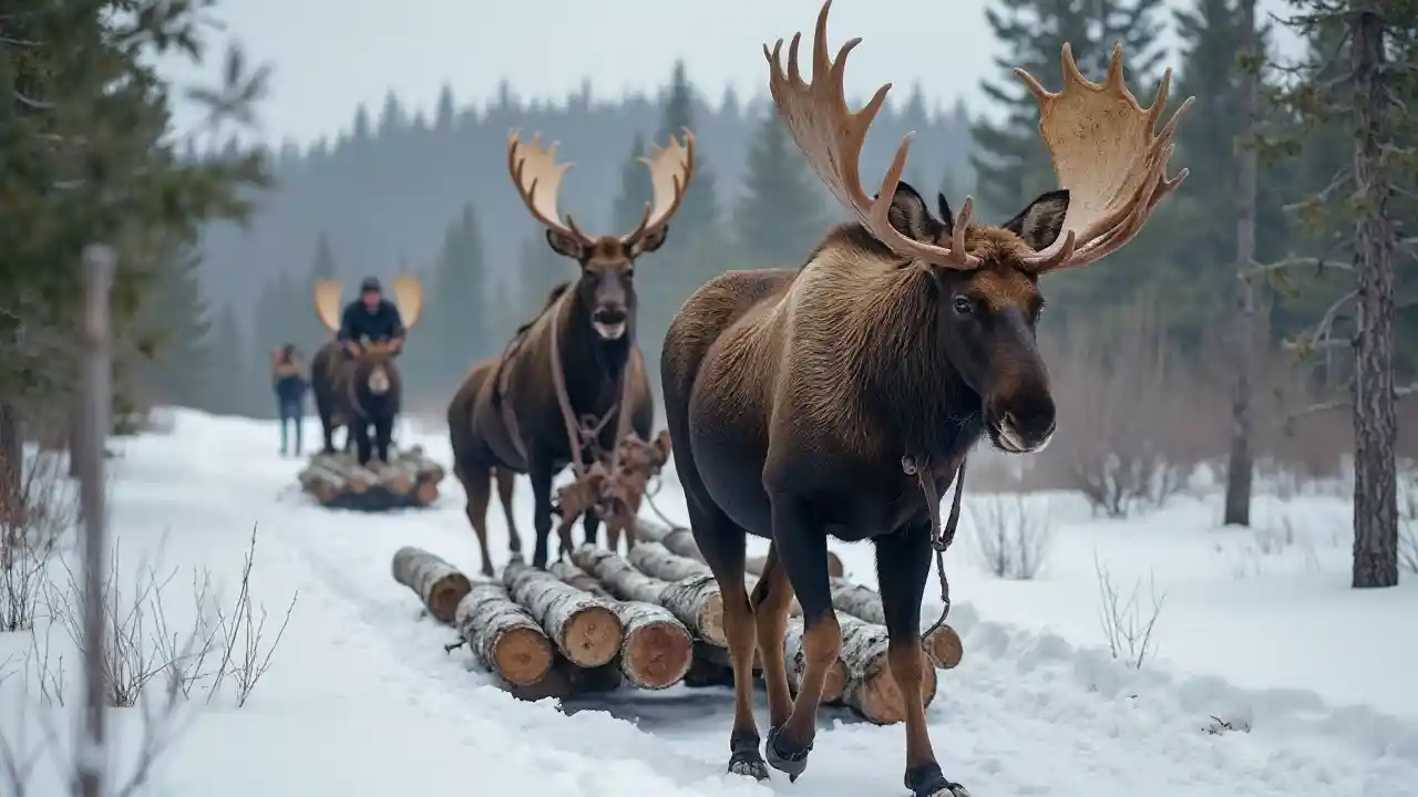 MackenzieUn gran alce toro aprovechado para derrapar troncos
