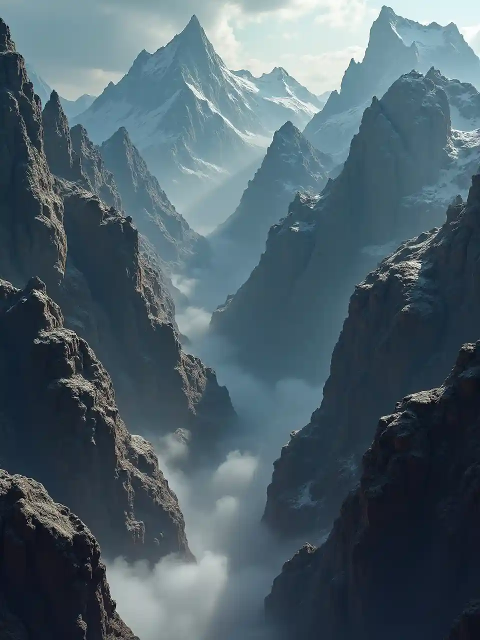 Las altas montañas con rocas flotantes forman objetos imposibles, 4D, enredados, isométricos, altamente detallados, asimétricos, ilusión óptica, geometría imposible, contraste agudo. Iluminación dramática. Oscuro con rayas claras.