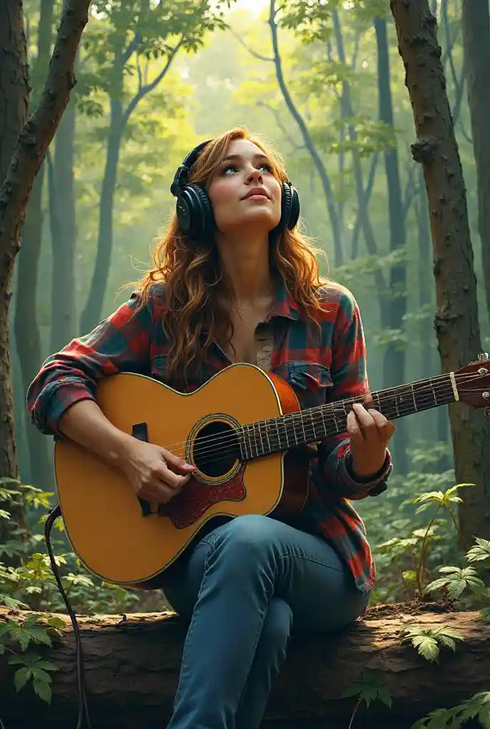 JoannaImpresionantemente hermosa, Emocionante Ilustración, mujer tocando guitarra acústica tocando en el bosque, chica de la música, Blues Rock Girls, grandes auriculares fuera del