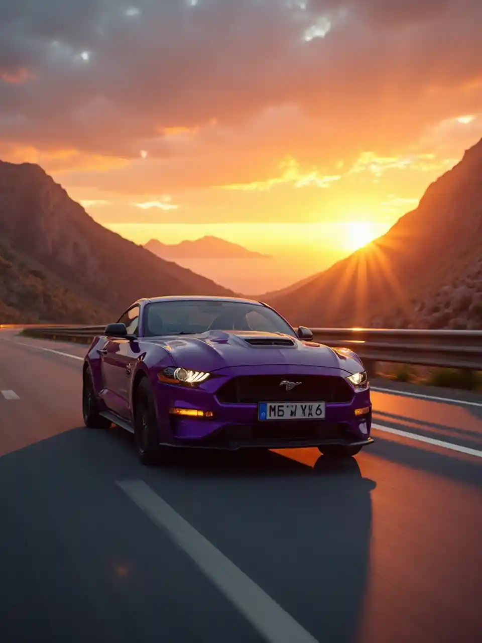 Ford Mustang Púrpura a toda velocidad al atardecer