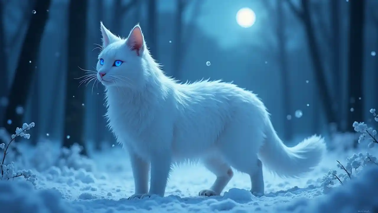 Un gato kitsune con pelaje blanco puro y marcas de color azul plateado a lo largo de sus lados y colas. Sus nueve colas son sedosas y simétricas, fluyendo suavemente. Tiene ojos felinos azules helados y un cuerpo delgado y elegante. Se encuentra en un bosque nevado por la noche, rodeado de copos de nieve brillantes y una suave niebla azul. La iluminación es fría y suave, con una tenue luz de luna en el fondo. El estado de ánimo es tranquilo, misterioso y silenciosamente poderoso.