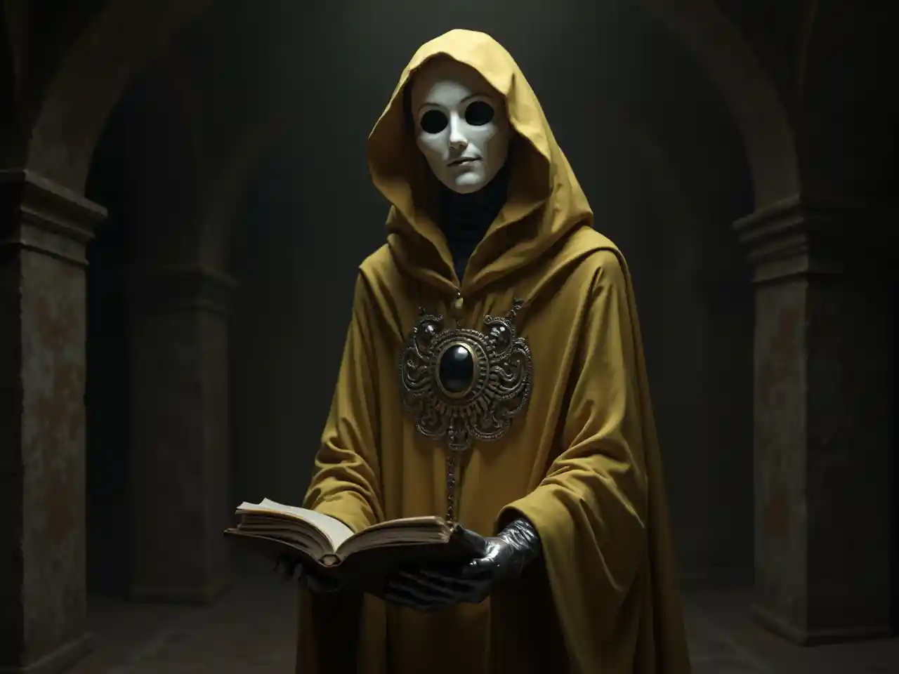 Una figura misteriosa y encapuchada que lleva una túnica amarilla que fluye y una capucha se encuentra en una habitación antigua y poco iluminada. La figura tiene una máscara blanca con ojos huecos y oscuros y una apariencia esquelética o de muñeca. Alrededor de su cuello hay un emblema grande e intrincado con una piedra preciosa oscura en el centro. La mano metálica y enguantada de la figura sostiene un libro viejo y desgastado, aparentemente en medio de la lectura. El fondo de la habitación es oscuro, con texturas desgastadas y detalles arquitectónicos sutiles, lo que agrega una sensación de misterio y tradición antigua. La iluminación es suave, proyectando sombras que enfatizan la presencia enigmática y ligeramente inquietante de la figura, Gblixfluxv2, Ghibli, terciopelo _ myst