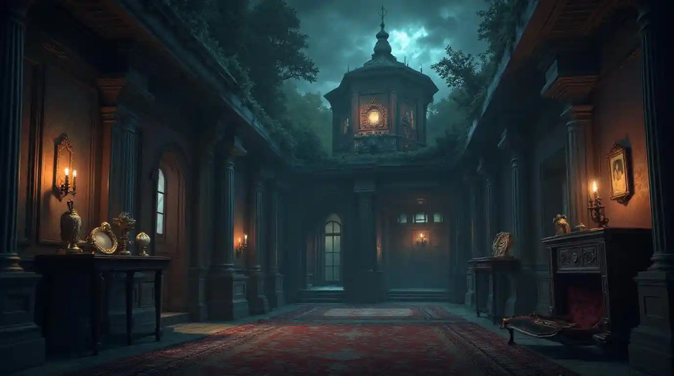 Mansión en expansión, habitaciones ocultas con artefactos malditos, canalizando oscuras vibraciones de anime de misterio.