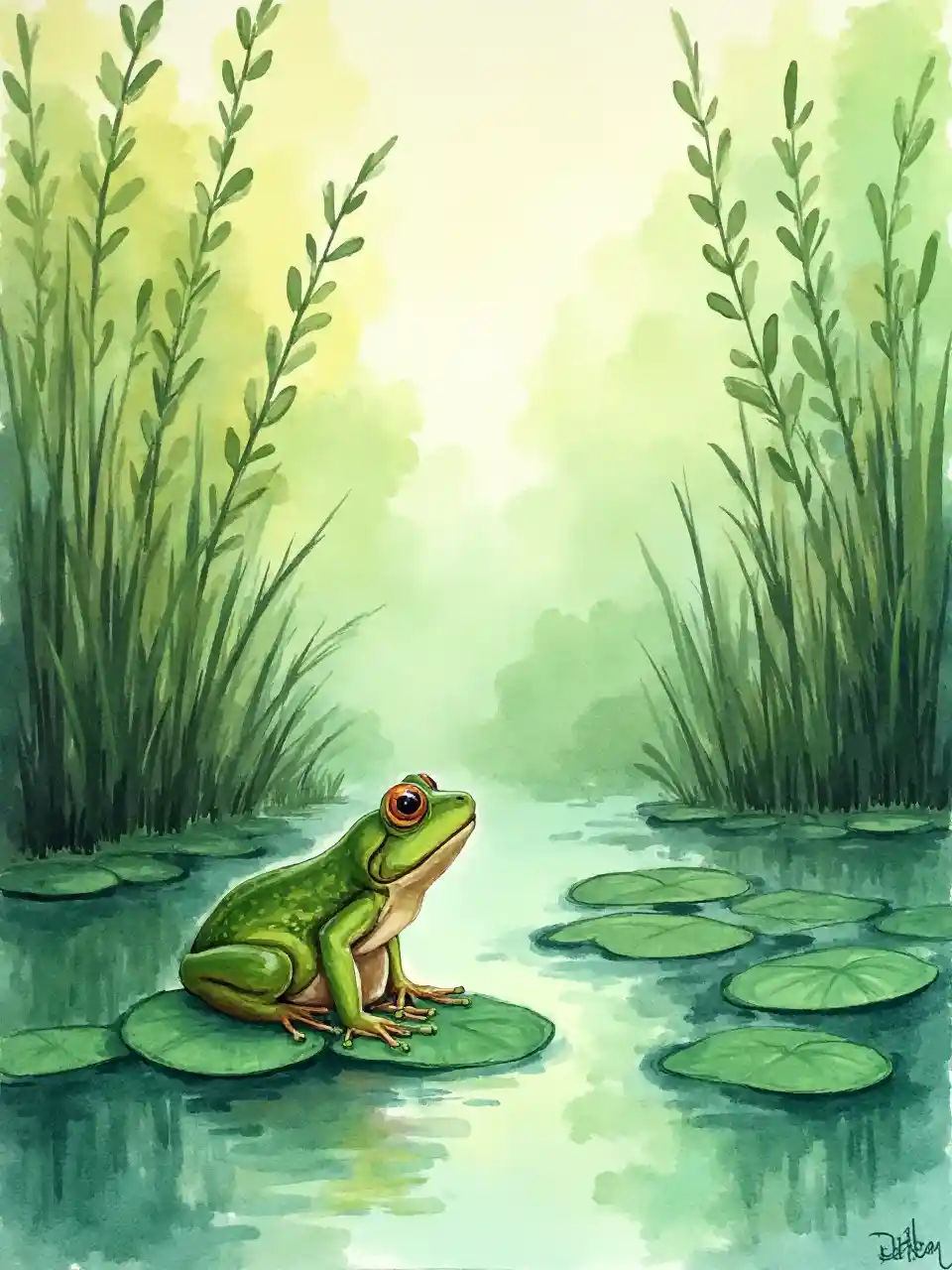 PenelopePintura de acuarela abstracta que ilustra este haiku: rana y estanque y el olor verde musgo de las horas