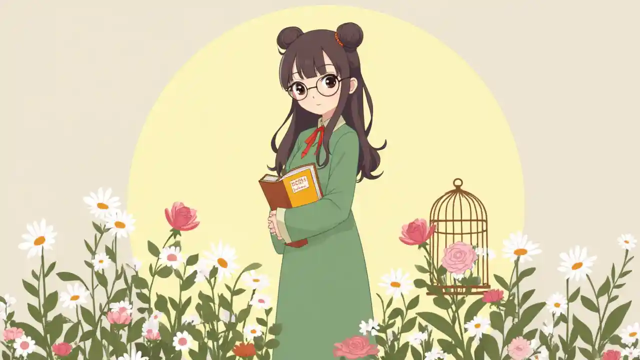 silueta de punto, silueta chica, 1girl, solo, tema del arco iris, círculo, color plano, sin linealidad, fondo de dos tonos texto en inglés, 1niña, jaula, jaula para pájaros, flor, vestido, solo, sostenimiento, anteojos, flor blanca, vestido verde, libro, libro de sujeción, mirando al espectador, flor rosa, hoja, flor amarilla, vestido largo, margarita, cabello castaño, mangas largas, planta, cinta, enredaderas, de pie, cinta para el cuello, cinta roja, cuerpo completo, vestido con collar, recto, ojos marrones, cabello largo, rosa, boca cerrada, rosa rosa, sonrisa, adorno para el cabello, anteojos redondos, cabello, cabello negro, rosa blanca