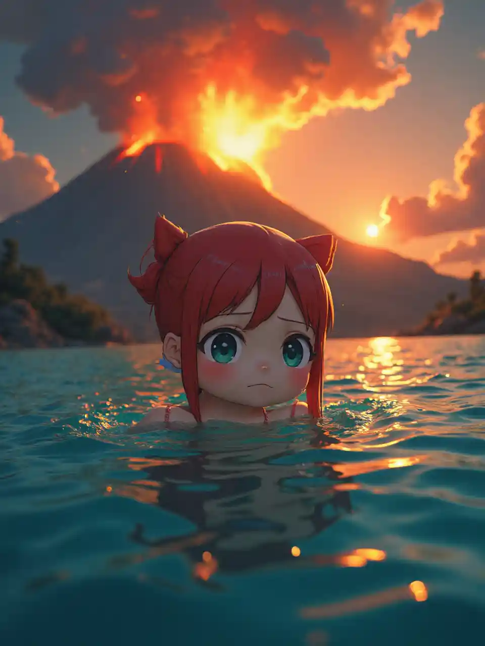 Una triste chica nekomimi nadando en medio de la erupción del volcán