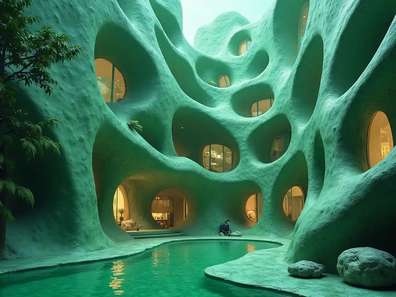 /dream prompt: amplio ángulo de visión de una paleta verde hiperrealista futurista neocósmica arquitectura exterior de lujo de líneas complejas Fachada fluida de un complejo en forma de espectro de ondas de piedra, estilo Antoni Gaudí, ambiente dramático, en la ciudad de Nueva York, hiperdetallado, estudio de luz, cámara nikon, 8k, --s1000 --estilo crudo