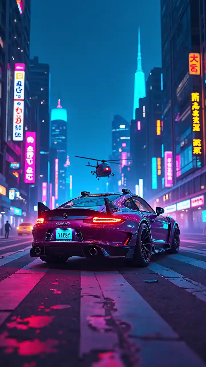 Auto futurista volando sobre una calle de la ciudad iluminada con neón por la noche, estilo de arte de graffiti, colores vivos, iluminación ultra detallada y dramática, ambiente cyberpunk, acentos de azul eléctrico y rosa intenso, rascacielos brillantes, temas de retrofuturismo, mostrando un entorno urbano bullicioso, helicóptero sobrevolando, composición cautivadora y dinámica, inspirada en Beeple, atmósfera vibrante y enérgica.