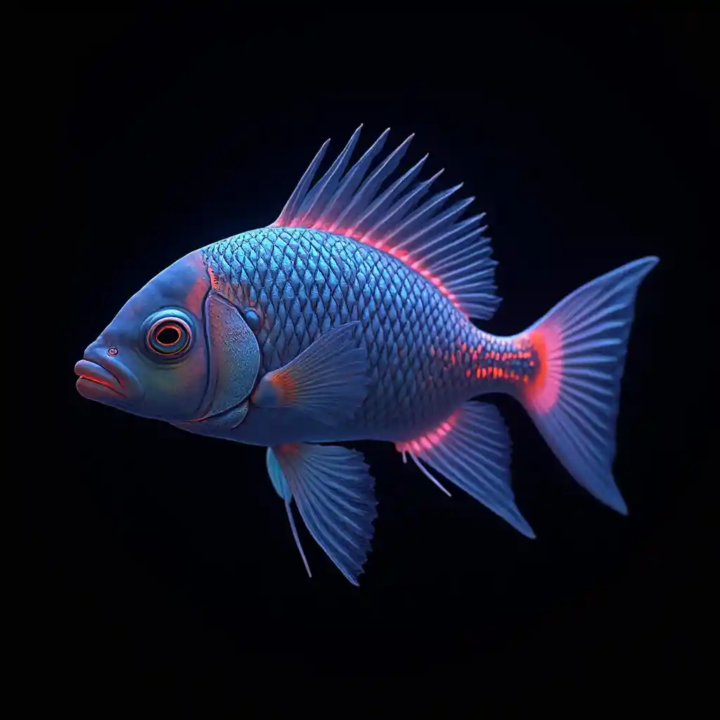 fondo negro, peces fosforescentes solos, hermosos colores neón y peces de aspecto real 3D