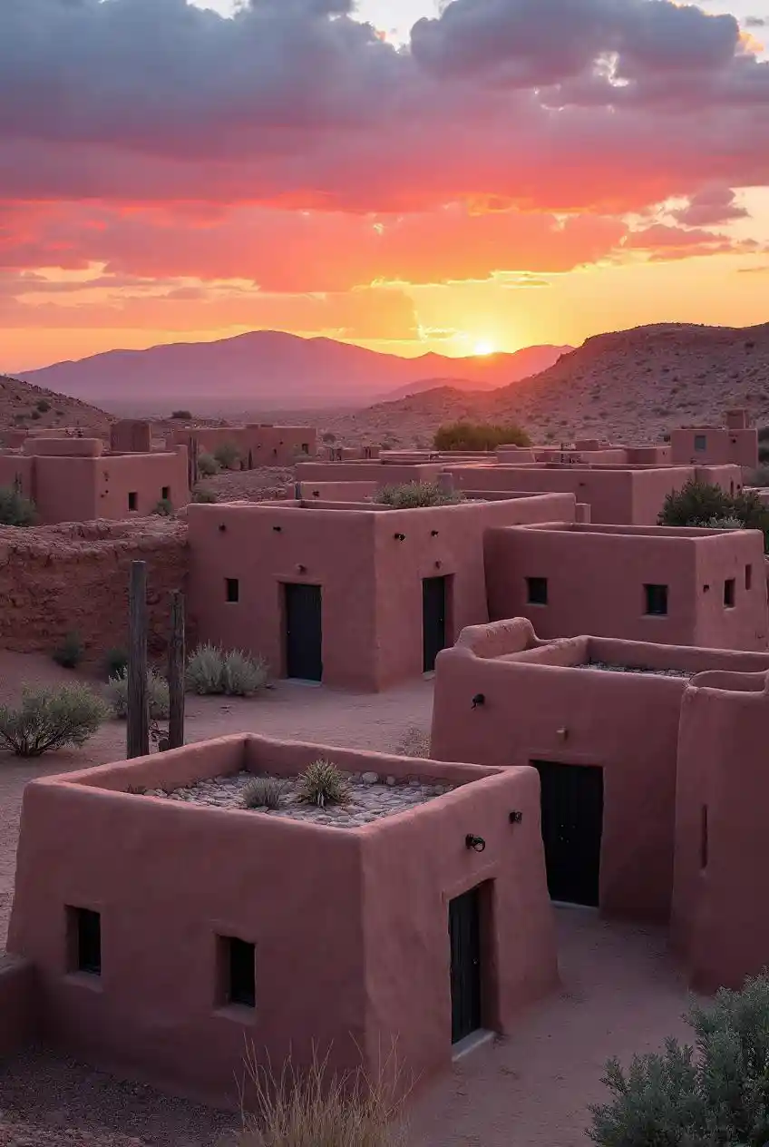 Pueblos de Adobe en Nuevo México que reflejan la paleta de puestas de sol.
