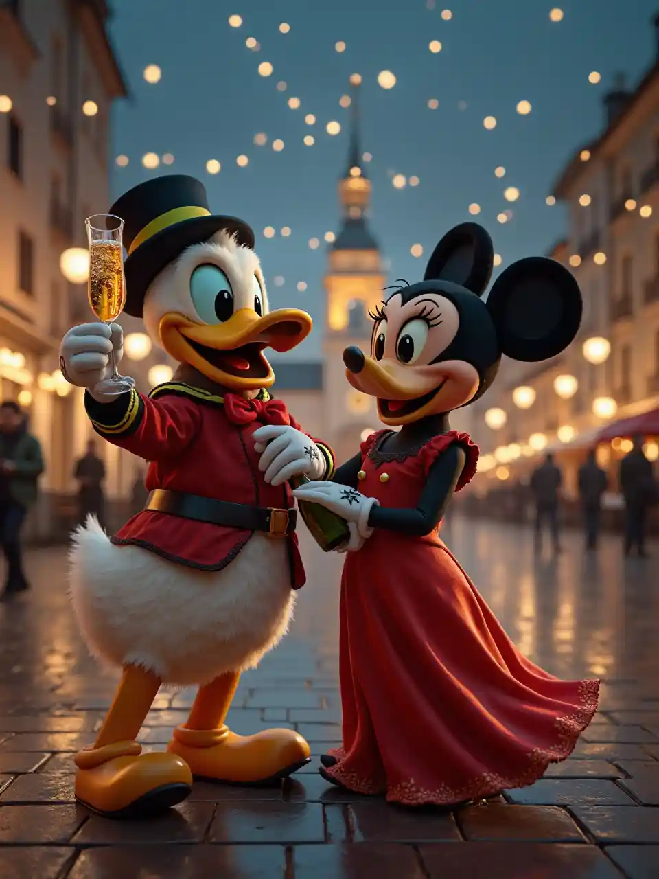 El Pato Donald y Mickey Mouse celebran la Nochevieja en la Marienplatz de Múnich, el Pato Donald sostiene una copa de champán en una mano y una botella de champán en la otra, Mickey Mouse baila con un vestido de noche con una joven rubia fotorrealista, 25 años joven, vestido de noche, muy delgado, fotorrealista, detallado, alta resolución, HDR, 16 k