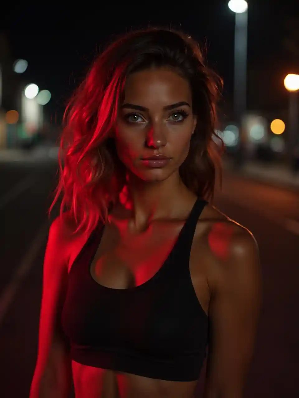 GabrielMujeres de fitness en calles nocturnas, fondo negro, cara bonita, reflejo de luz roja en su rostro, ojos verdes
