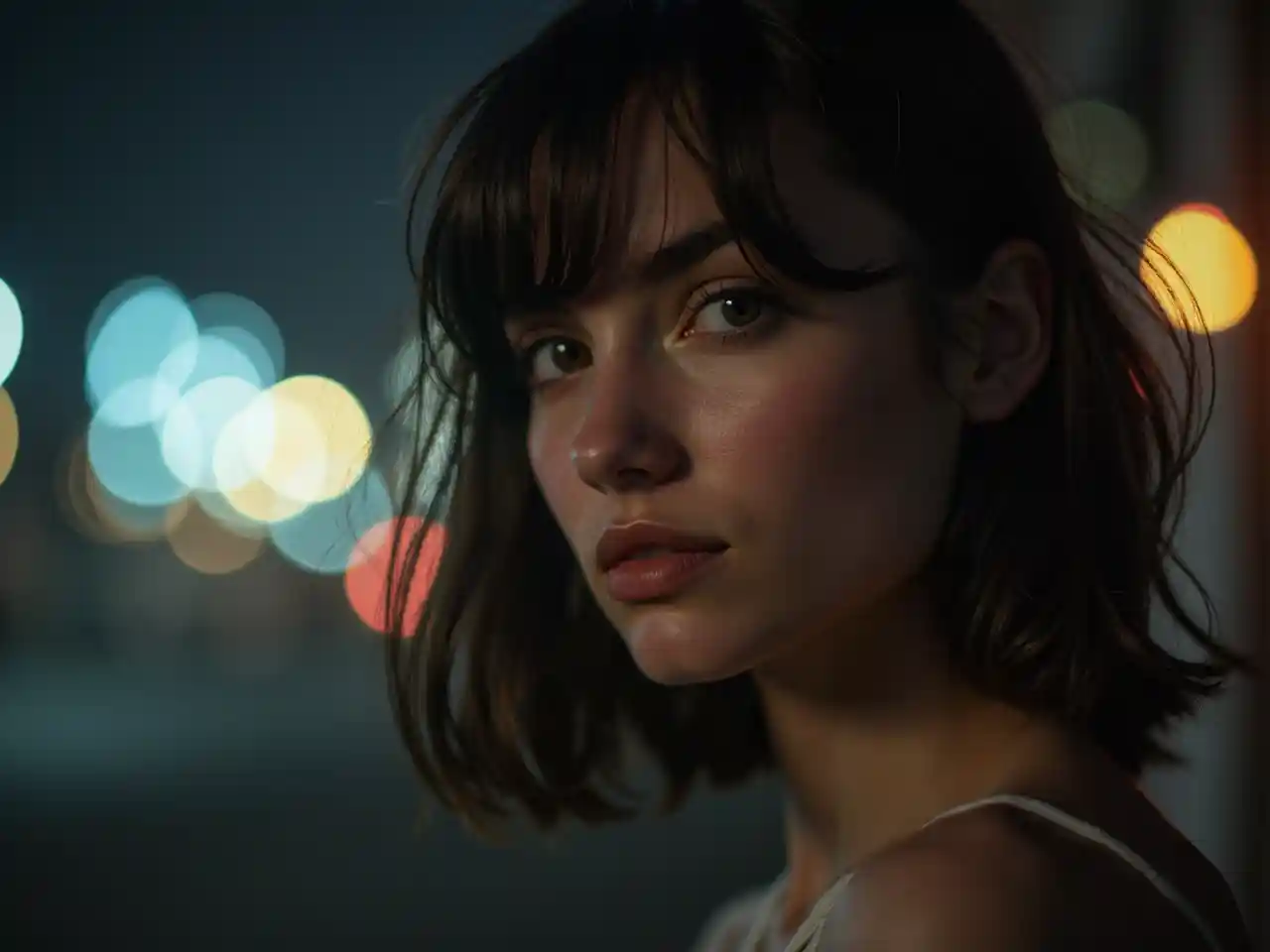 foto, foto de noche, foto de 24 y.o hermosa mujer, piel pálida, bokeh, desenfoque de movimiento