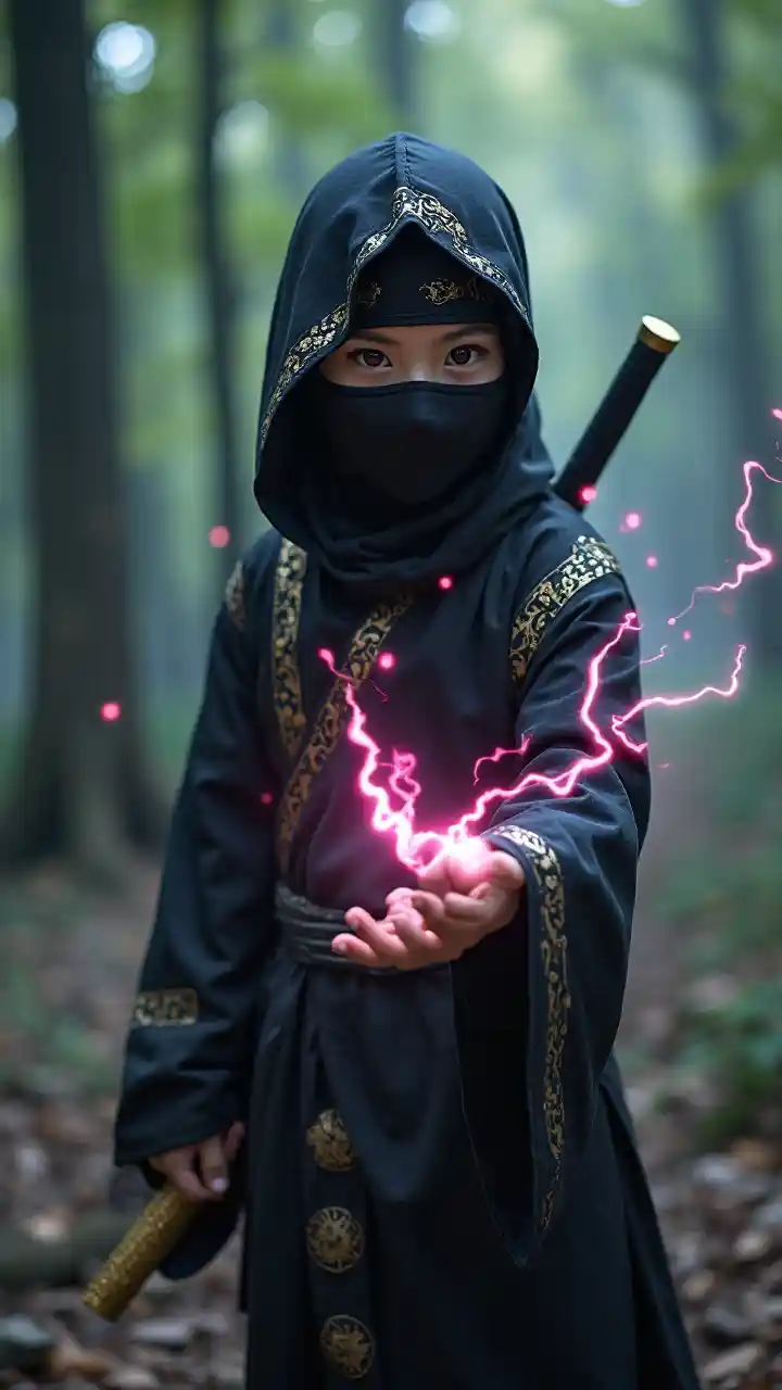 Una escena cautivadora de un ninja juguetón en un bosque místico
