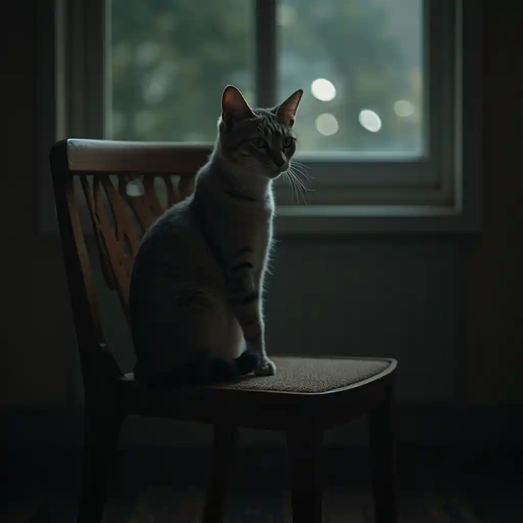 Gato sentado en una silla, melancólico, fotografía, film noir, bokeh