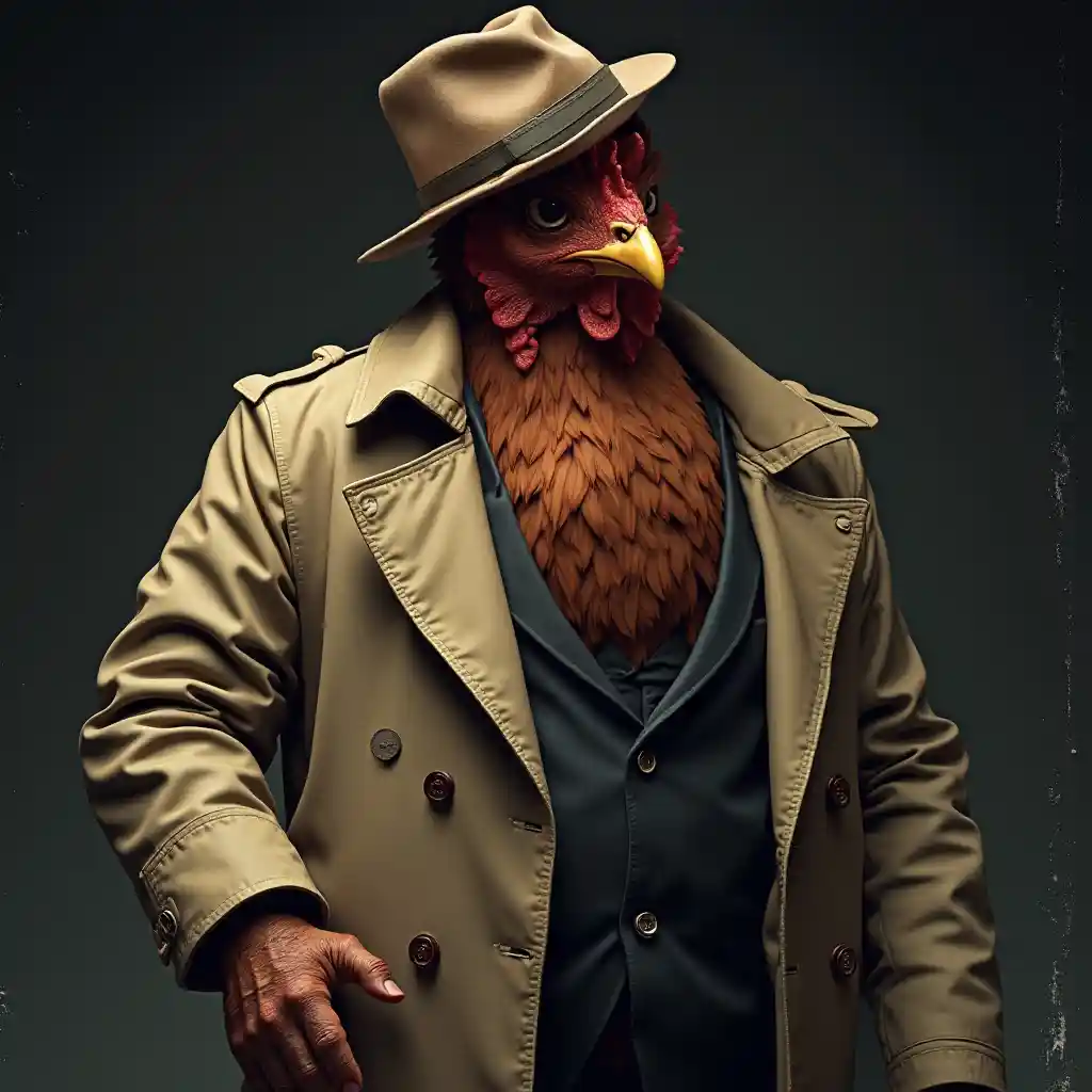 póster de película de estilo cine negro con un pollo con gabardina y sombrero de fieltro.
