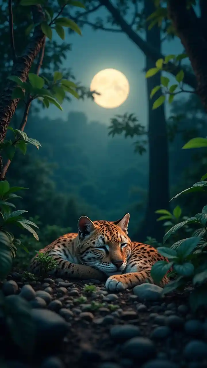 GabrielUn ocelote que duerme bajo los arbustos de la selva tropical, la luz suave proviene de la luna llena.