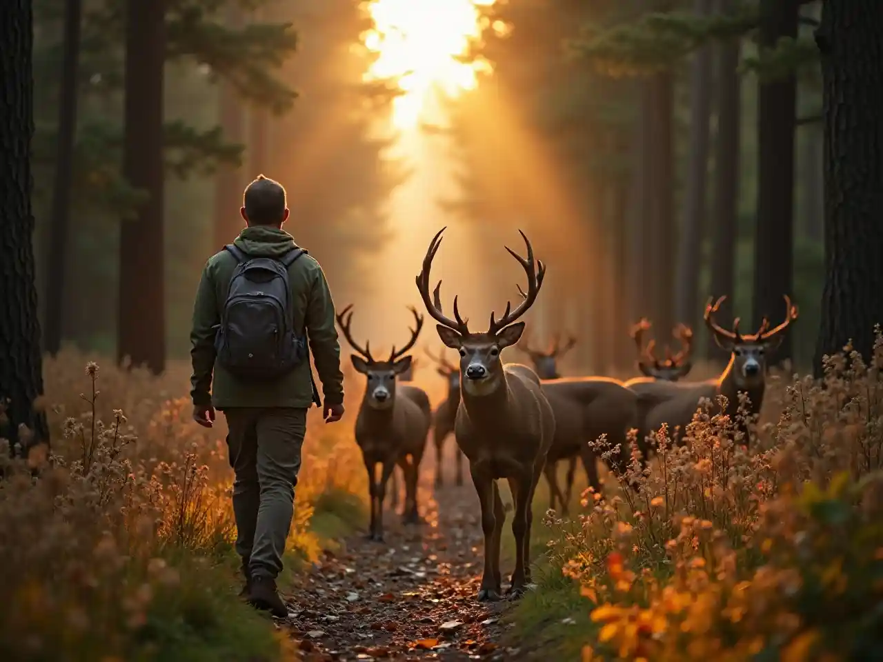 Un hombre caminando en los bosques de Oregón con un grupo de ciervos, cálida y tierna iluminación