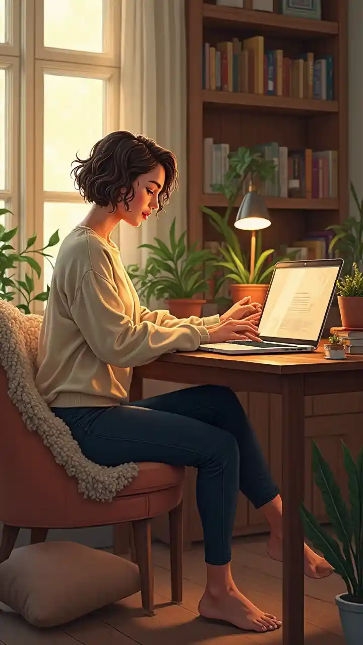 Una hermosa mujer con el pelo corto lío se sienta con gracia en un escritorio de madera en un ambiente acogedor de la casa, encarnando una presencia tranquila y enfocada., mirando a la computadora portátil, Ella tiene una postura elegante pero relajada, una pierna casualmente doblada mientras que la otra cuelga ligeramente del borde del escritorio. Su cabello está suavemente alborotado, captando el cálido resplandor de la luz ambiental de una ventana cercana. Está vestida con ropa casual cómoda pero elegante, tal vez un suéter de punto suave y jeans ajustados o una blusa que fluye combinada con mallas. La computadora portátil frente a ella está abierta, su pantalla ilumina su rostro suavemente, lo que sugiere que está profundamente involucrada en un trabajo creativo o reflexivo. A su alrededor, la habitación está llena de detalles cálidos y acogedores: un sillón de felpa con un tiro de punto, estantes forrados con libros y plantas, y cojines suaves esparcidos por el suelo. El ambiente general es íntimo e inspirador, inspirado en Pam Hawkes, Audrey Kawasaki, Troy Brooks y ((Alphonse Mucha)).