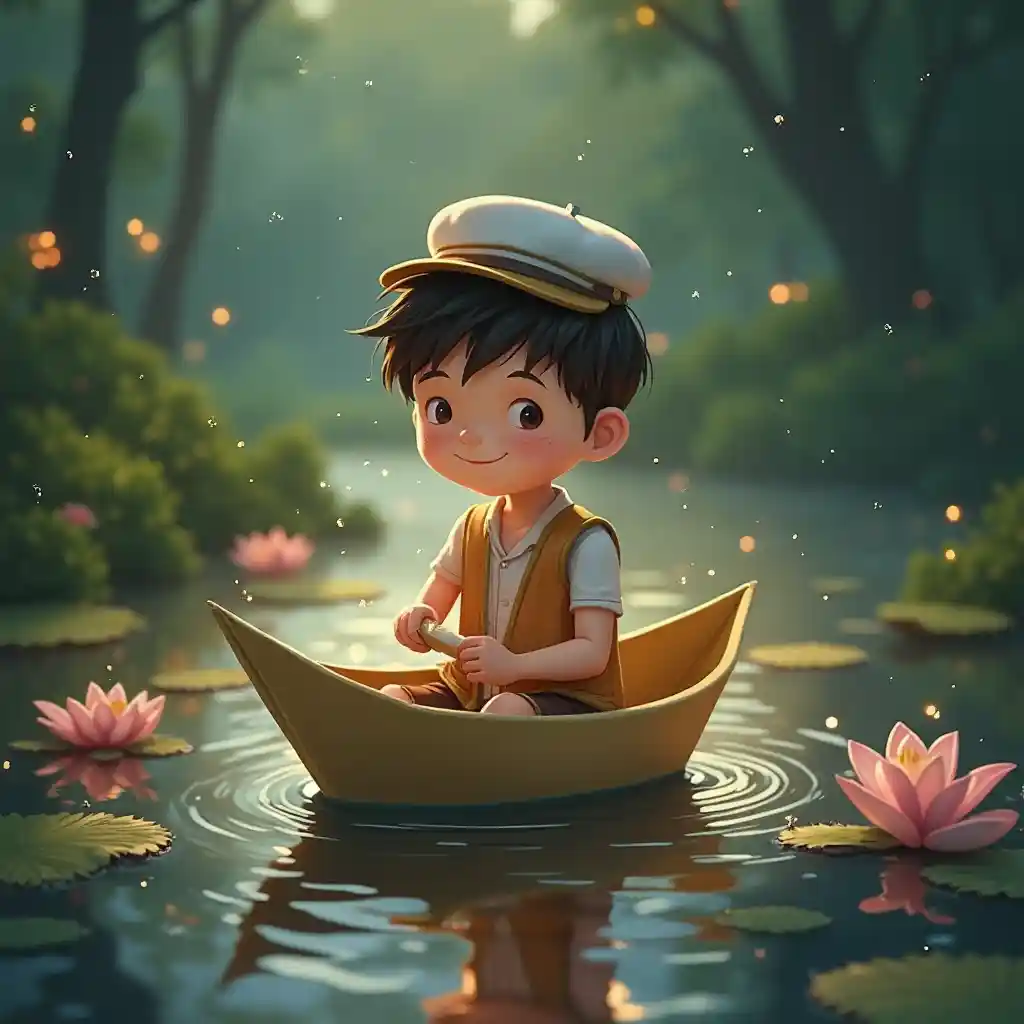 Navegando un bote de papel en un arroyo resplandeciente, un niño blanco de 7 años con pecas usa un sombrero y un chaleco de marinero. Luciérnagas y flores de loto lo enmarcan, sus suaves empujones irradian curiosidad y serena aventura en un entorno natural de ensueño.