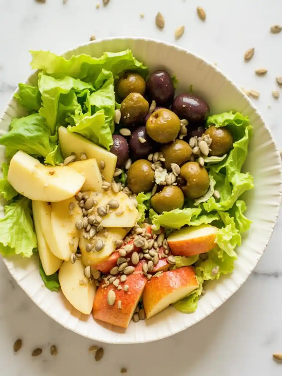 Un tazón de papel lleno de lechuga, aceitunas en rodajas, rodajas de manzana, adornado con semillas de girasol y aderezo César.