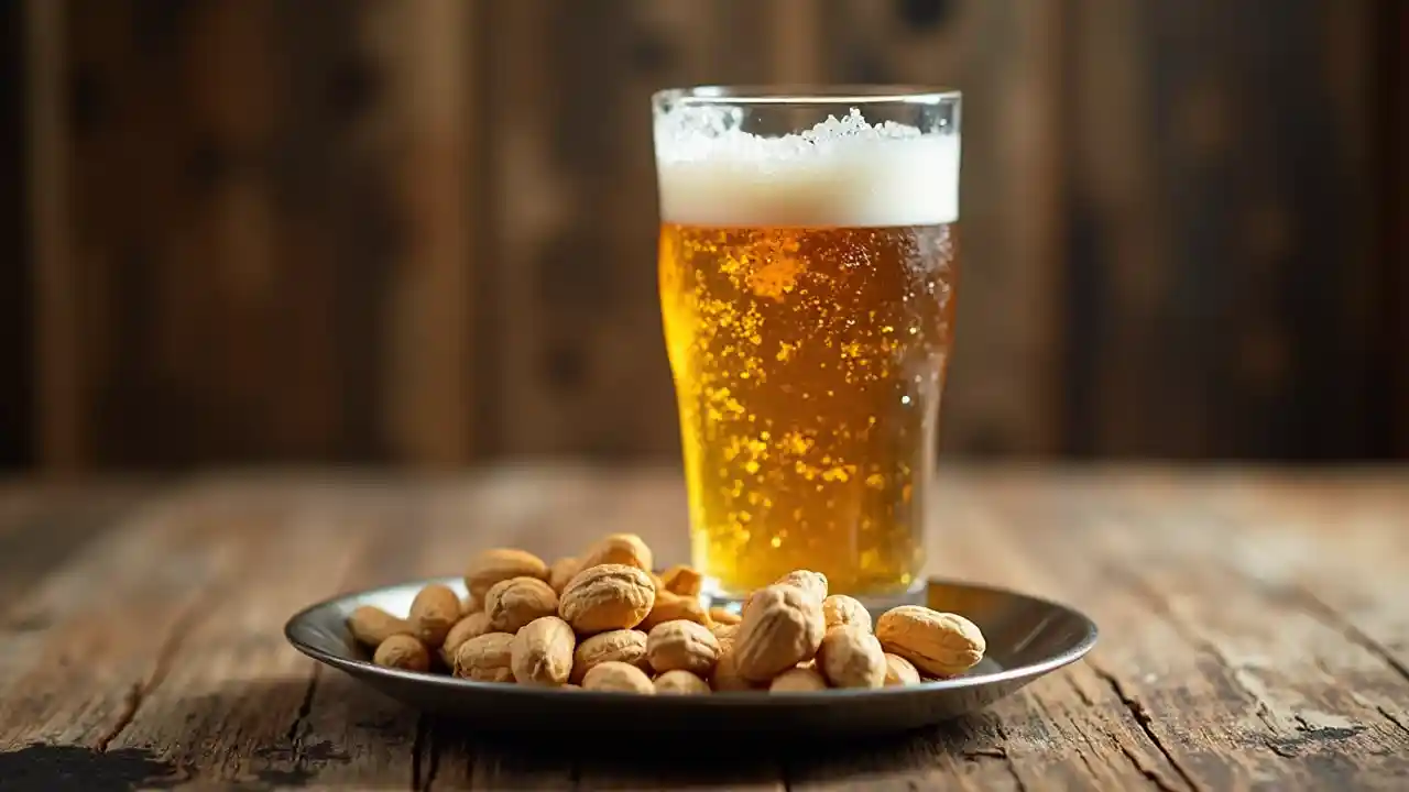 pequeña placa redonda de acero inoxidable llena de cacahuetes secos, una hermosa pinta de cerveza, remolino de cerveza dentro del vidrio, una pulgada de espuma blanca en la parte superior, cerveza transparente, vidrio congelado, publicidad, altamente detallada