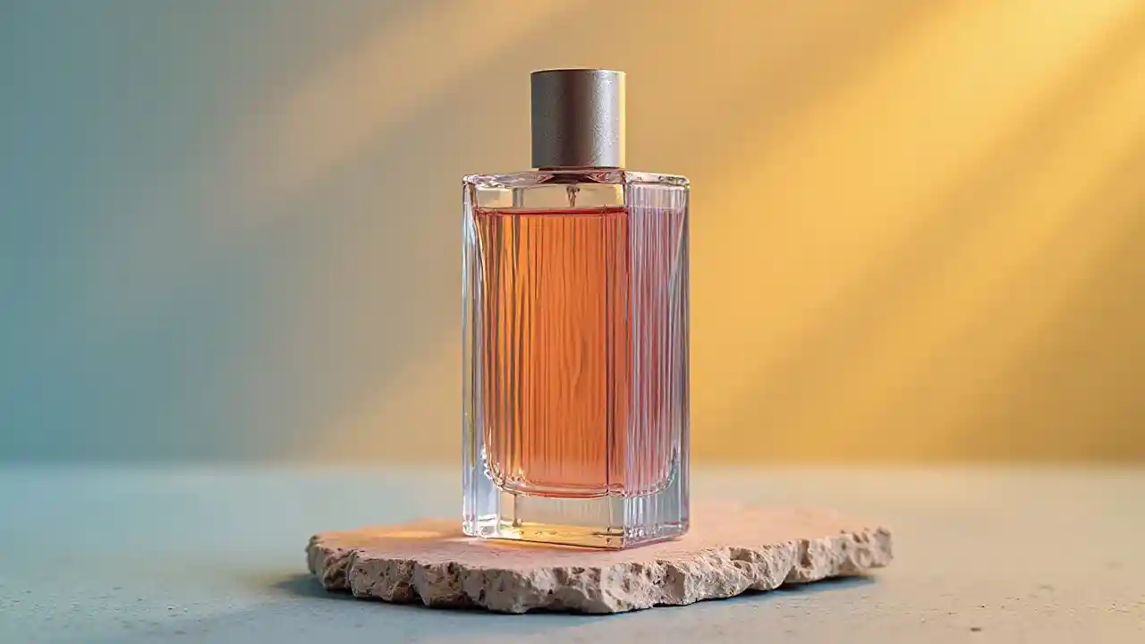 Botella de perfume de vidrio alto con textura orgánica